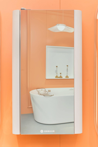 鏡柜內部的美妝鏡背收納3.0系統,巧妙利用鏡后空間,打造“可視化”智能收納區。不同高度的護膚品、化妝品可有序直立擺放,隨用隨取。抽紙孔隱藏于鏡柜側邊,取用便捷且防塵防潮。搭配半透明玻璃柜門,常用物品一目了然,告別翻找困擾。