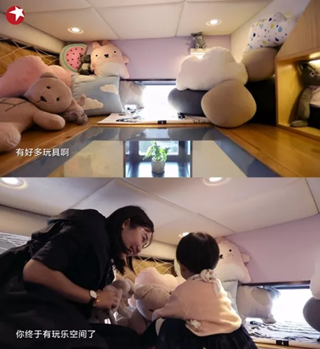 設計師根據全家人的身高比,在客廳上方隔出了一個可利用夾層,為米寶打造了一個屬于自己的游樂場,讓孩子也有了屬于自己的玩??臻g。